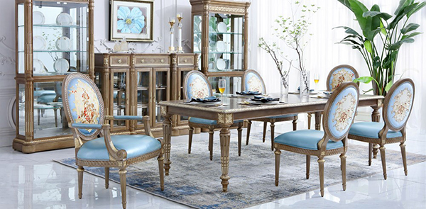 The round back panel design of the French Louis XVI period, coupled with the exquisite carving and gold-plated platinum craftsmanship, as well as the tapered foot design, demonstrates the distinguished identity and elegant taste of the owner. The soft bag mainly in lake blue adds a modern, fresh and fashionable look.