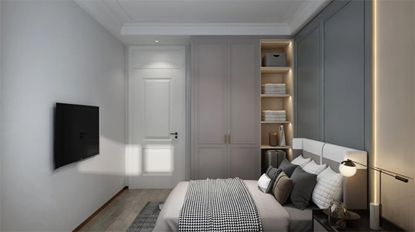 In the elder’s room keynoted by a gray spatial tone, the combination of gray and white reinterprets classics and high quality, and is matched with a wardrobe with concise lines and an opening-closing design, looking steady yet vigorous. The right open part contains concealed light strips, and looks warm and decent.