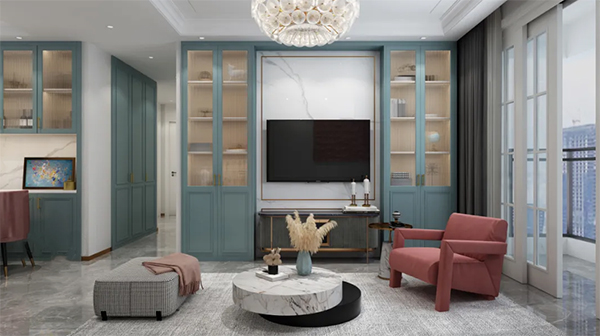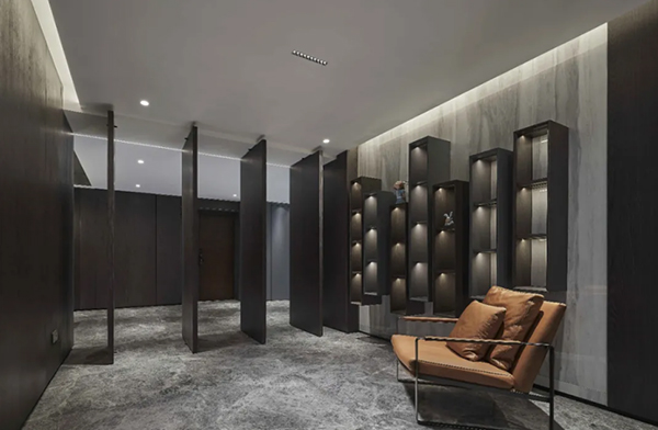 The ingenious combination of glass and door panels enhances the transparency of the living room space, and is set off by lighting to fully reveal the close connection between elegant luxury and modern design aesthetics.