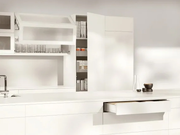 Visually concise and appealing Blum no-handle furniture is used for the kitchen as a whole, and the dynamic opening-closing technology makes the furniture design more ergonomic. Just press the panel gently, and the tilt-up doors, ordinary cupboard doors and drawers can open freely, bringing extra enjoyment to the user.
