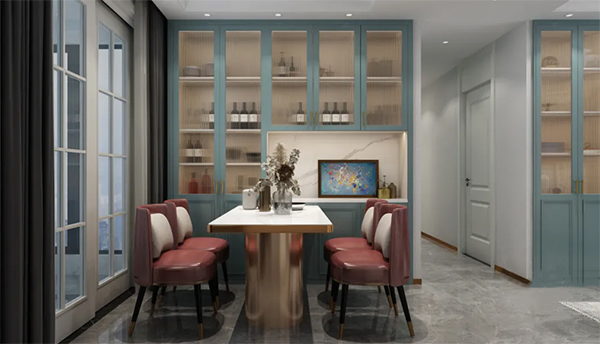 Long-rainbow glazed swing doors are used for the sideboard. The wavy surfaces with stereoscopic visual effects and rich layers break away from the traditional flat style of glass, and make the dining room more attractive.