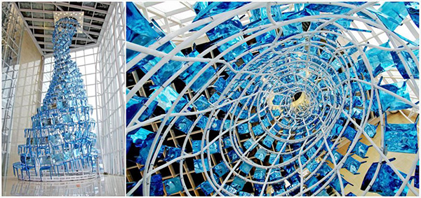 When you enter the mall from the left of the Parrot Chair, you will be impressed by the brilliant Chair Pyramid, which is composed of 382 chairs of varying sizes stacked together. With a shining blue chrome-plated surface, it cascades down like a clear spring.