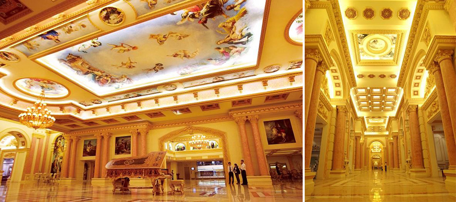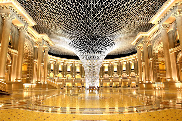Behind the Golden Hall is the Constellation Plaza. The cyclone-shaped steel structure extending from the ceiling to the floor is the world’s largest single dome structure and China’s largest European-style atrium, consisting of 14,884 steel parts and 5,060 nodes. The European-style walls surrounding the plaza reproduce classics of Roman architecture and fine baroque crafts.