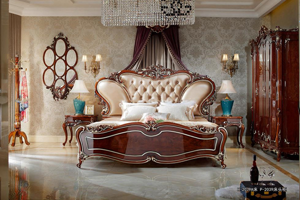 Photo by courtesy of Gold Rich at 3FB21, Louvre International Furniture Exhibition Center (European-style neoclassical bed made mainly of beech), Foshan