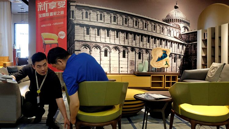 Dans ce centre commercial haut de gamme, situé au bord d'une autoroute, des fabricants chinois aux noms baroques comme Baily, Mucham Vuitton, Louis Noble ou encore Bottega Radice, exposent dans leurs showrooms canapés, fauteuils et autres tables de repas - y compris de nombreuses copies. « Sélection méticuleuse, matériaux premium, écoresponsabilité garantie », lit-on sur les panneaux publicitaires.